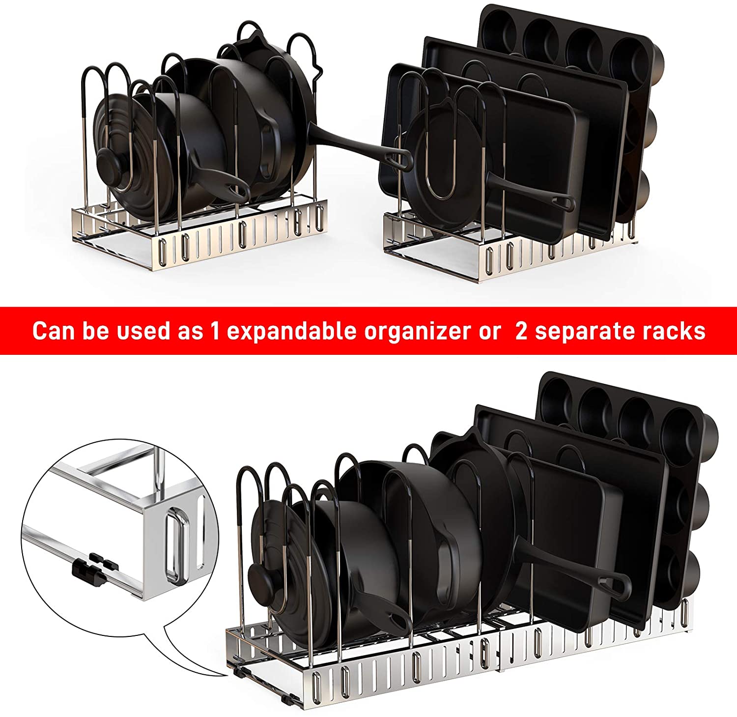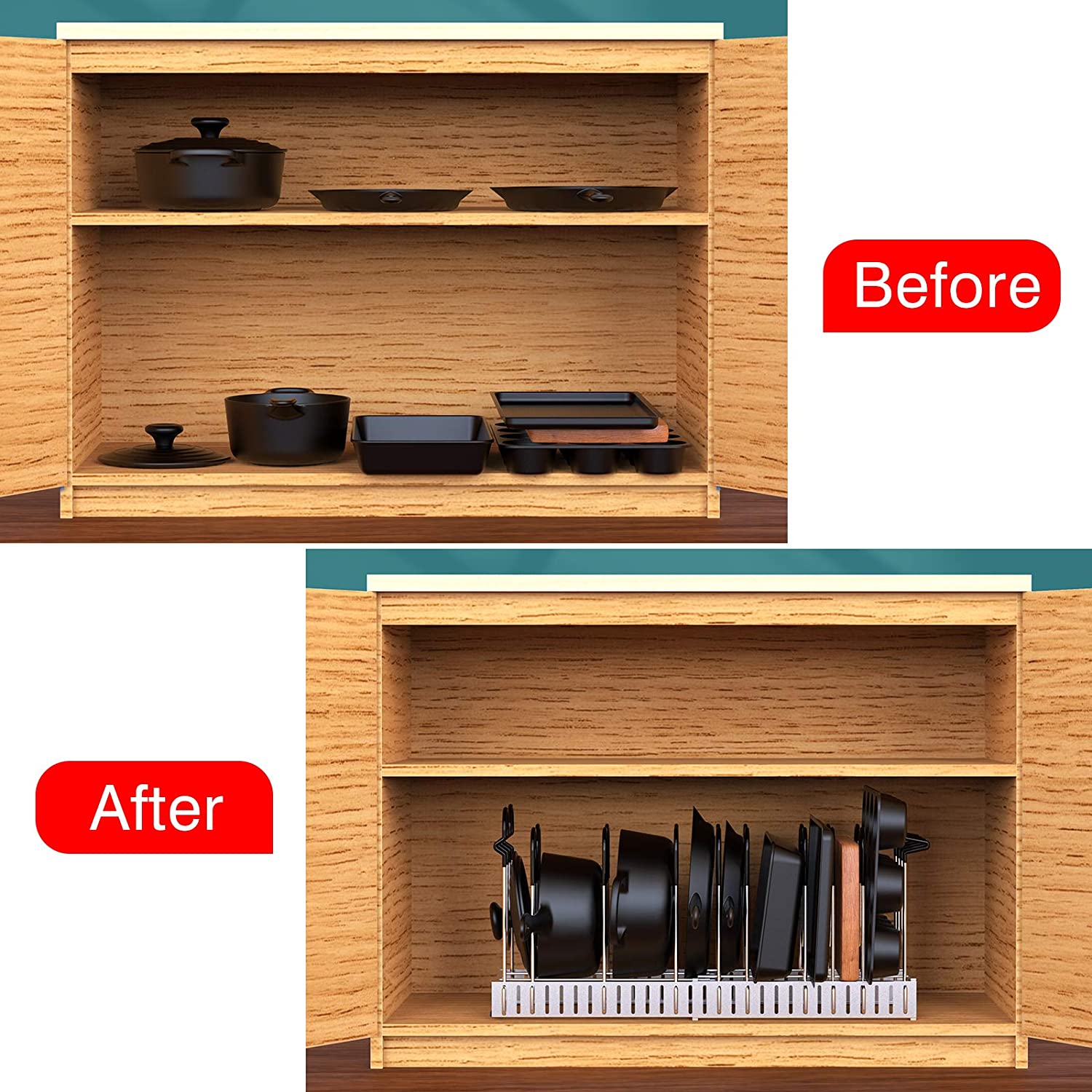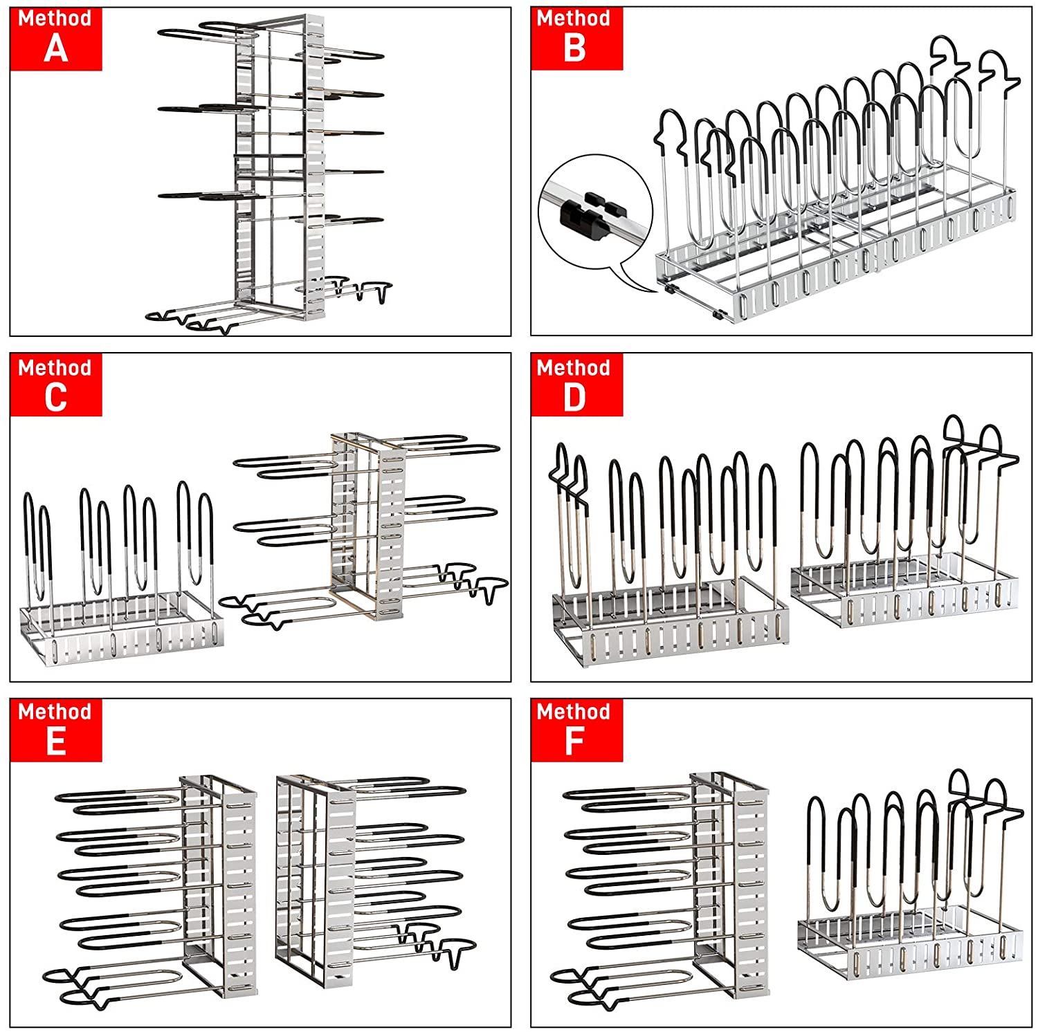The pot and pan organizer comes with 10 dividers, easy assemble and no tools needed; 6 DIY application allows you to place your pots and pan according to your needs. No more mess in your kitchen courtop or your cabinet.