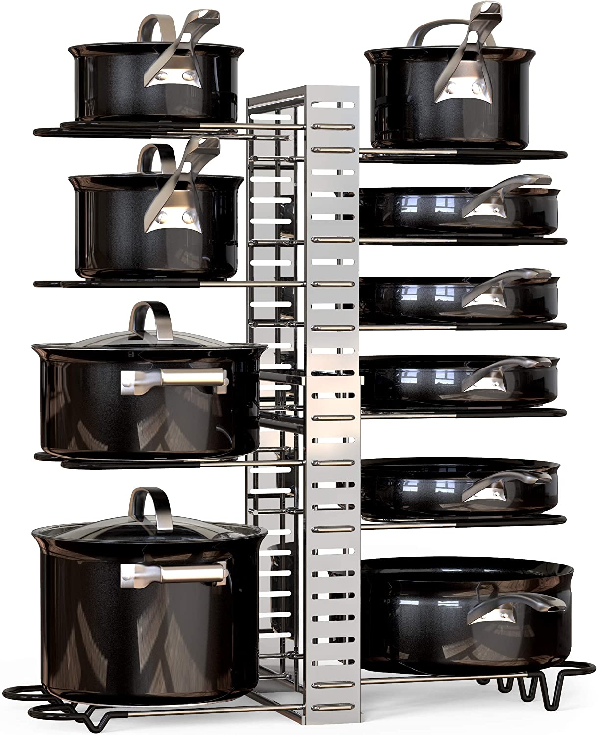 The height, position, and length are adjustable which provides flexible storage, allowing storage of all your cookware in one rack. Store up to 10 pots and pans safely and tidily. Perfectly fits your different sizes cabinet.