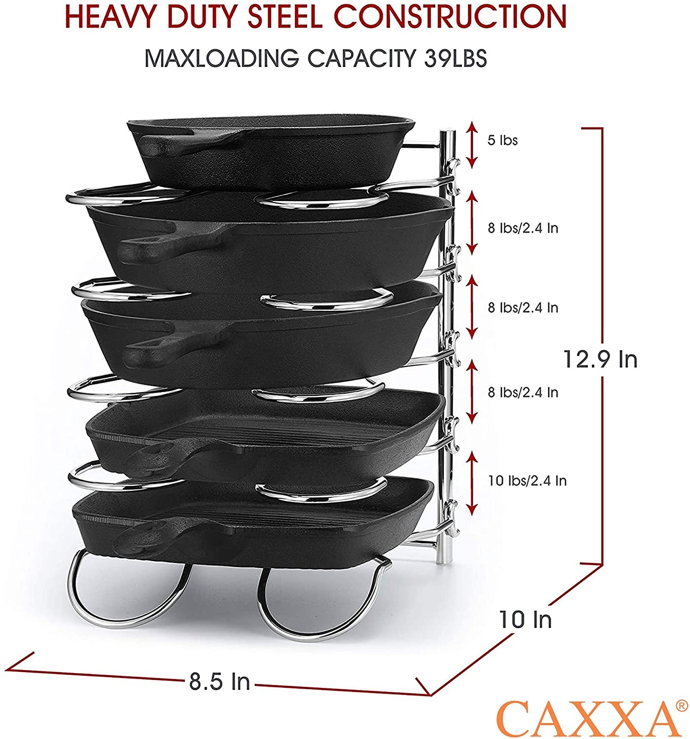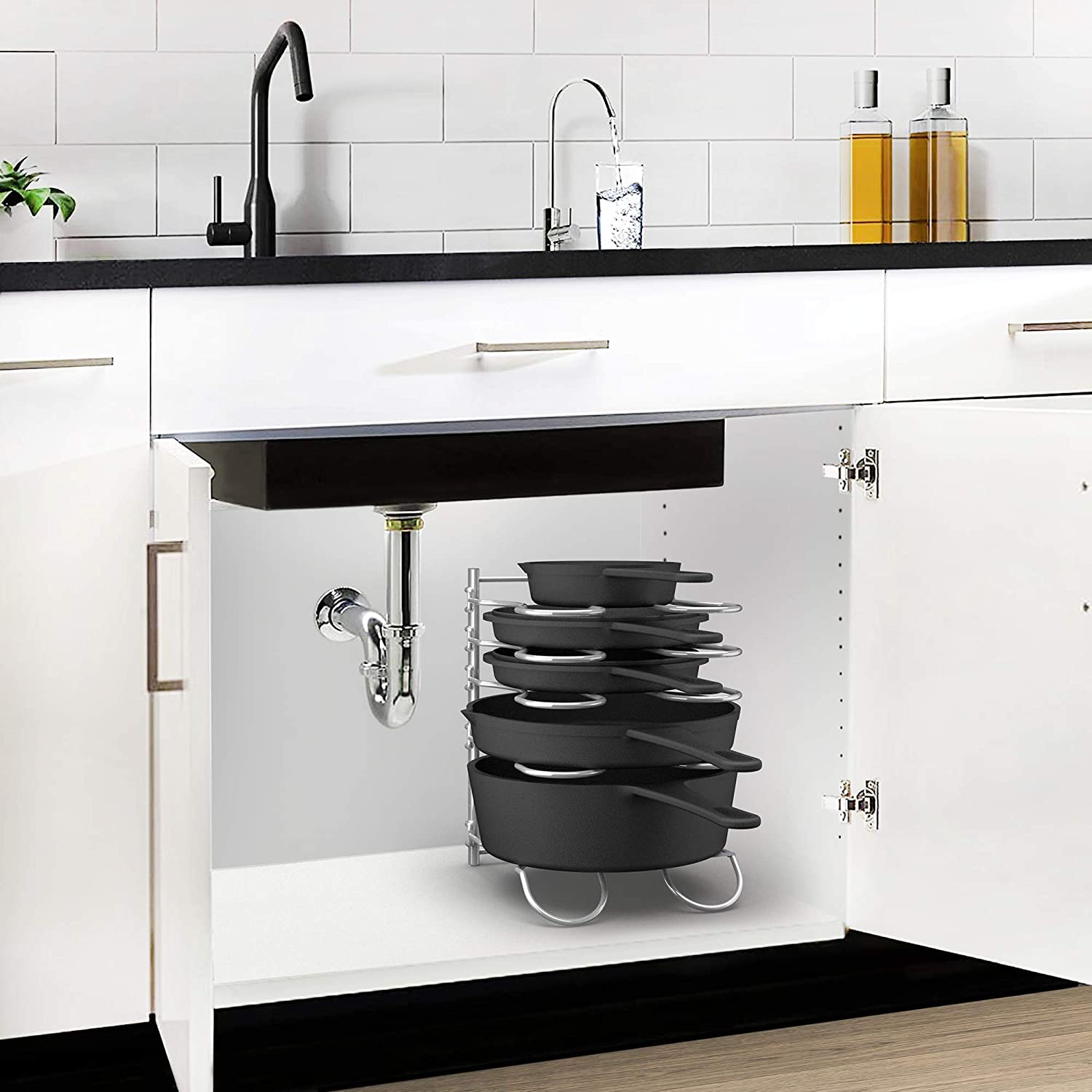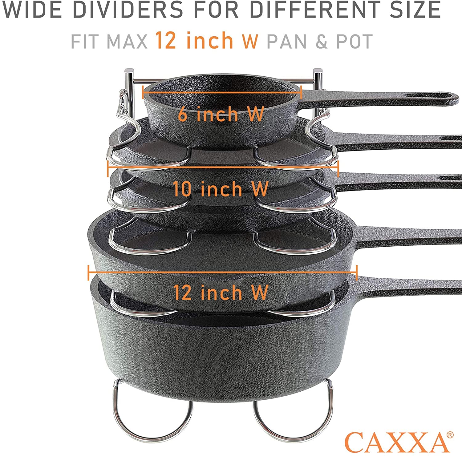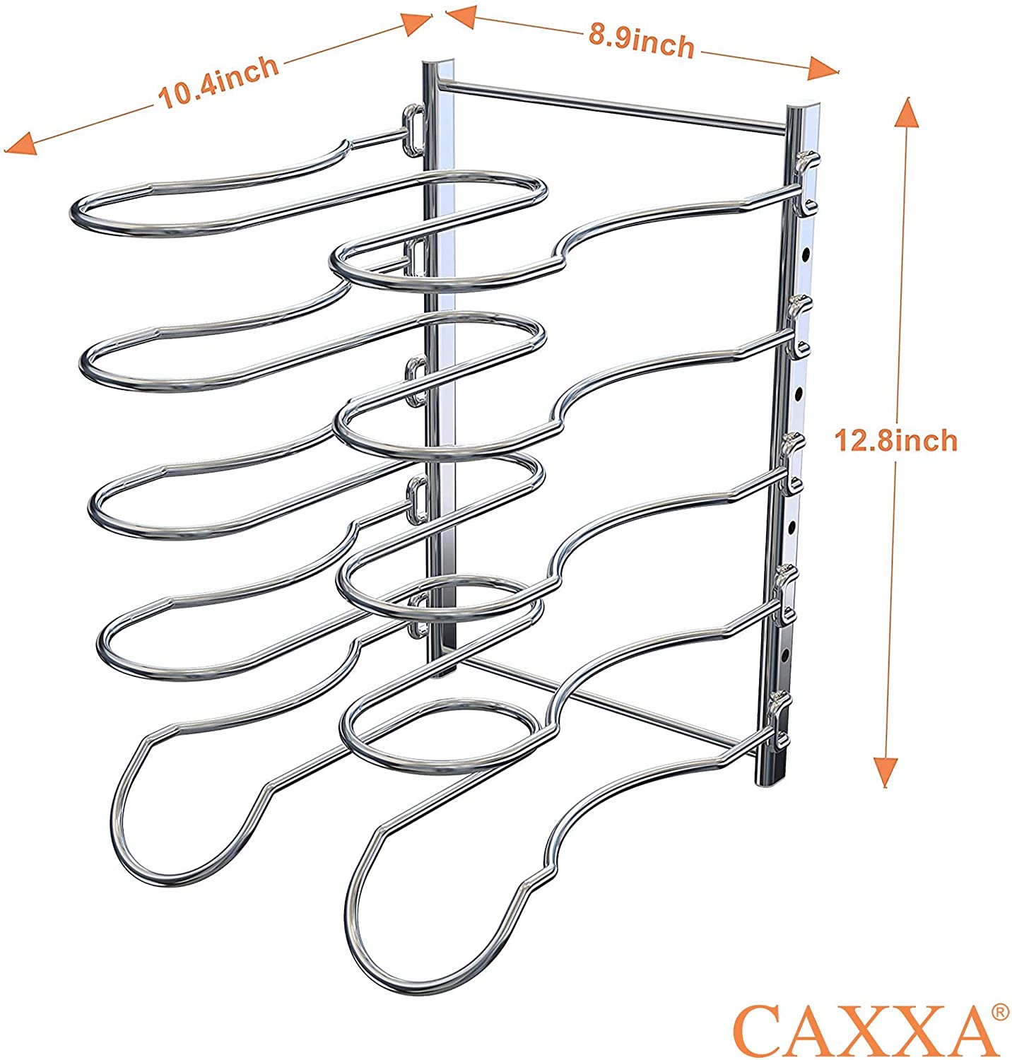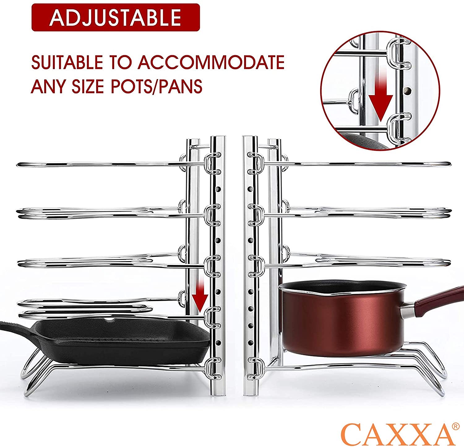 CAXXA Heavy Duty Pan Rack, Pot Lid Rack, Kitchen Cabinet Pantry Cookware Organizer Rack Holder | 5 Adjustable Dividers, Chrome