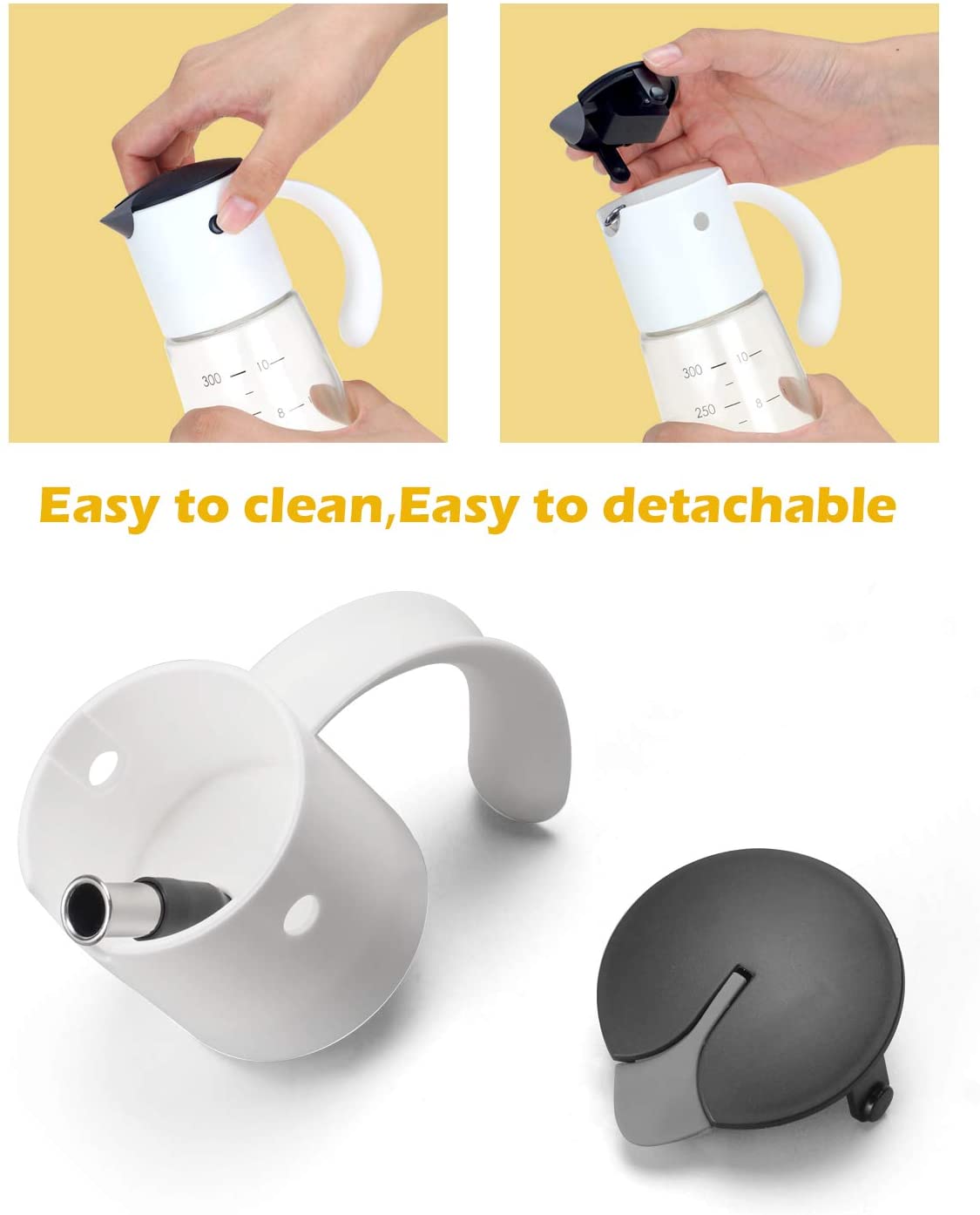 EASY TO USE--Gravity lid-spout opens and closes automatically when bottle is turned upwards or downwards. Non-drip spout and detachable top makes it easy to clean,just press down the location of 2 black eyes, pull out the black lid.NOTED:OIL NOT INCLUDED
