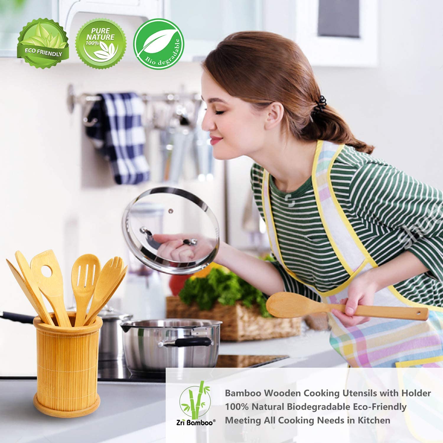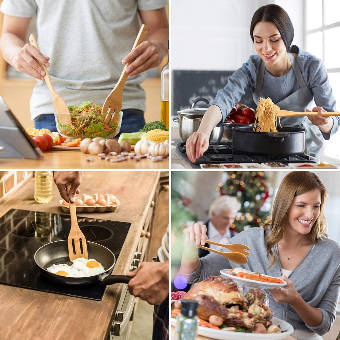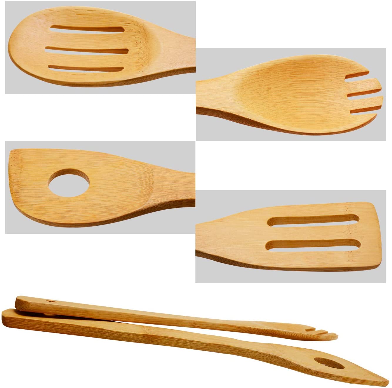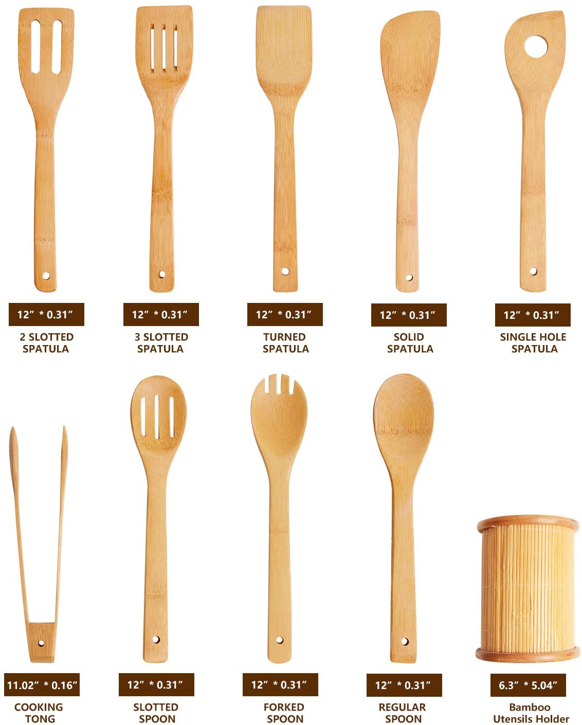 9 Piece Set with Holder: The wooden utensils for cooking include 5 pieces spatulas, 3 pieces spoons and 1 piece tong, meet all cooking needs in kitchen for frying cooking baking and stirring. A bamboo crock is included, the large holder unit has enough capacity to house your own kitchen utensils too or could be used for pens holder
